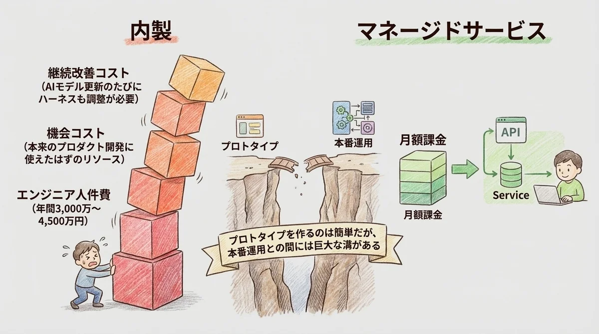 特にスタートアップにとって、限られたエンジニアリソースをハーネス構築に割くことの機会コストは甚大です。