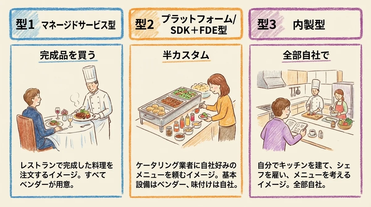 2つ目は、プラットフォームやSDKを使いつつ、ベンダーのFDE(Field Development Engineer)が自社の業務に合わせてカスタマイズしてくれるモデルです。
