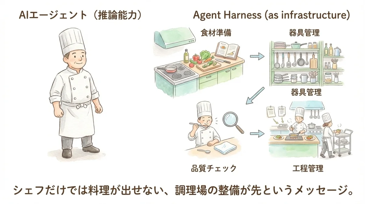 - エージェントハーネス = 調理場(キッチン設備、食材管理、衛生管理、オーダー管理)