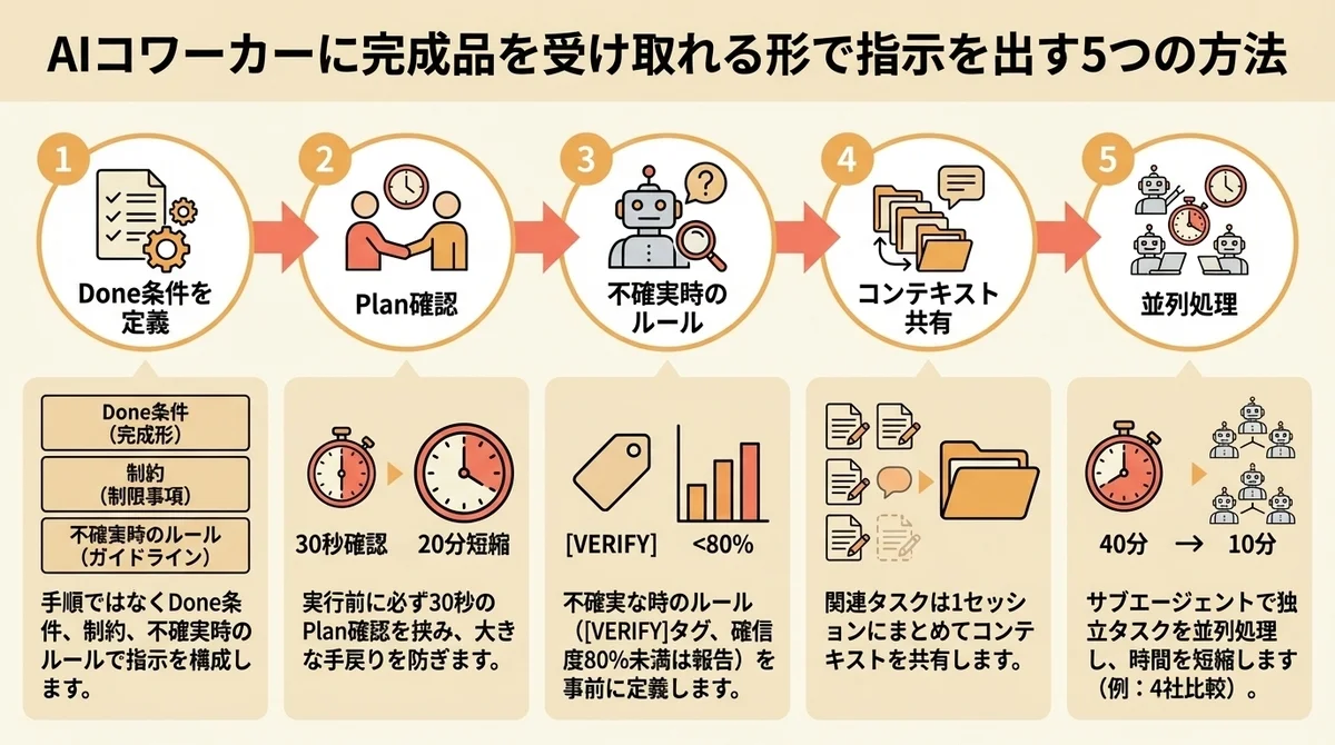 - 1つの完成形を定義して依頼する ── 方法6の「Done条件・制約・不確実時のルール」形式で1回タスクを投げてみる