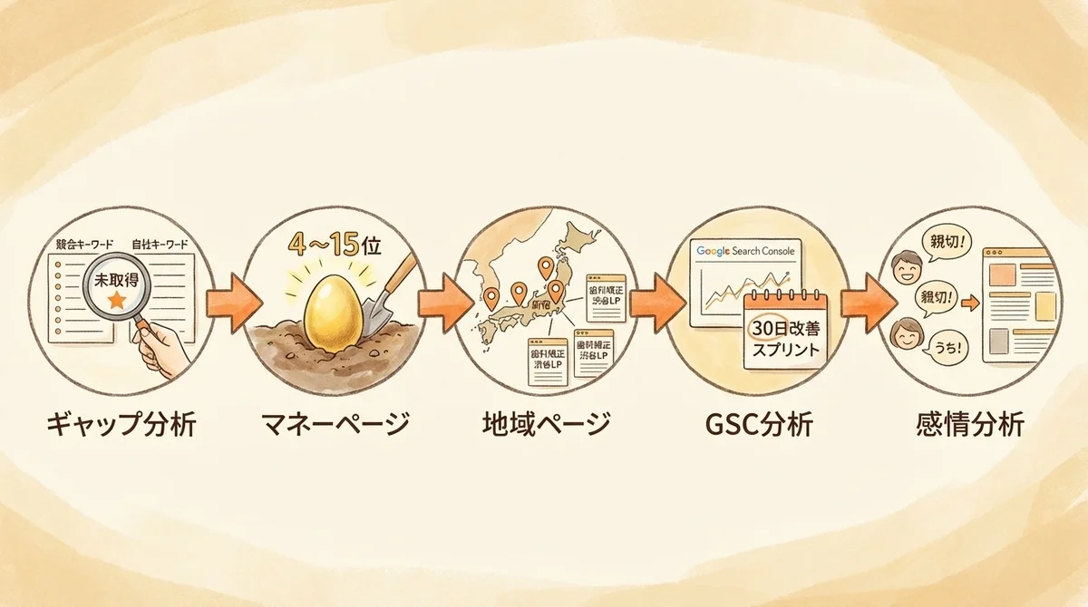 4. 再訪(「○○ アフターケア」「○○ メンテナンス」)検索意図を段階別に整理することで、「このページは何を目的に作るのか」が明確になります。