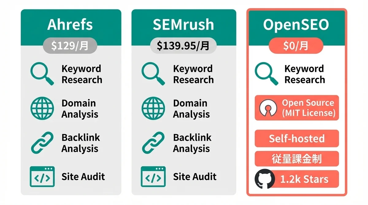 つまり、「企業のSEOチームが本格運用する」場合はAhrefs/SEMrush、「個人やスモールチームが必要な時だけ使う」場合はOpenSEO、という棲み分けですね。