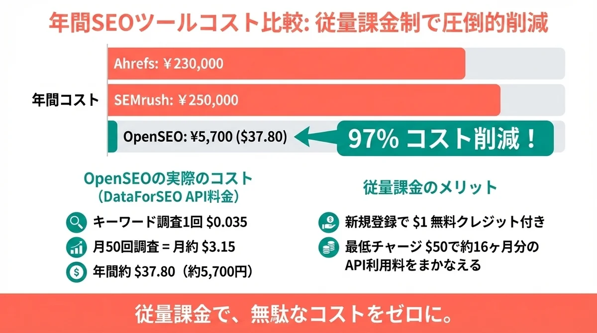 これが何を意味するか——Ahrefsで月$129払って得ていたキーワードデータを、1回あたり数円で取得できるということです。