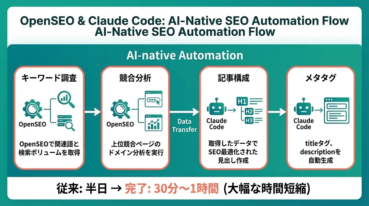 従来なら半日かかっていたSEO調査が、この流れなら30分〜1時間で完了します。