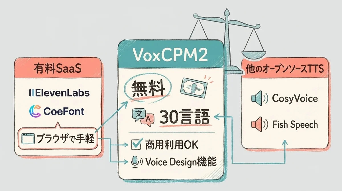 VoxCPM2は「30言語対応 + Voice Designが無料で使える + 商用利用OK」というバランスの良さが魅力です。