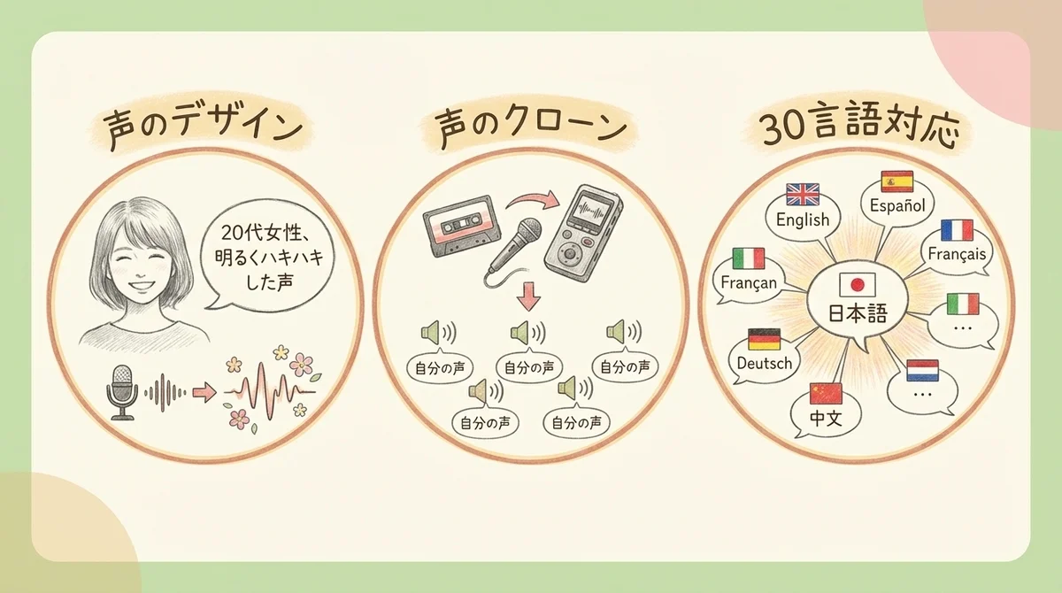 Voice Design機能を使えば、若い女性の声、落ち着いた男性の声、元気なキャラクターの声など、用途に応じて声を使い分けられます。