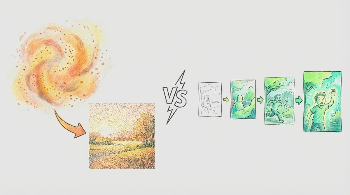 従来のAI動画生成(拡散モデル)は、いわば「点描画を描くような作り方」です。