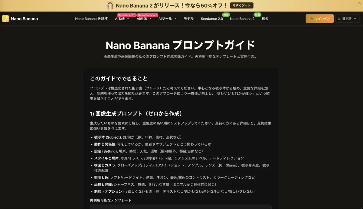 nanobanana.ioは、日本語で体系的にNano Bananaのプロンプト設計を学べる実践ガイドを提供しています。