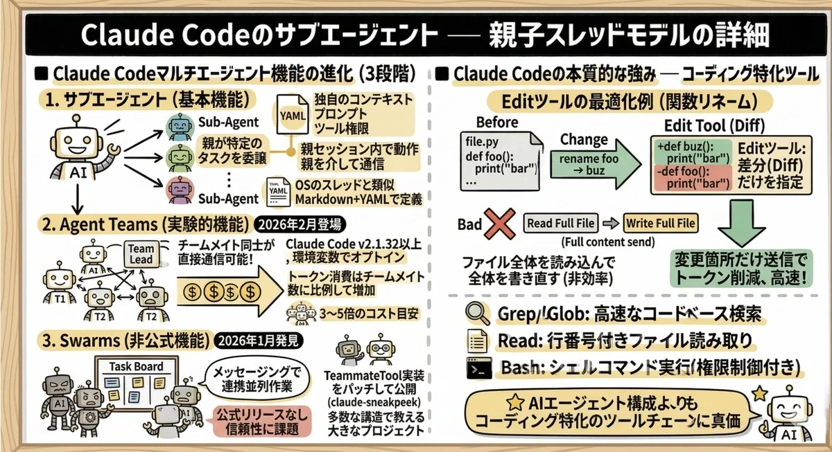 Claude Codeの真価は、マルチエージェント構成よりもコーディング特化のツールチェーンにあります。