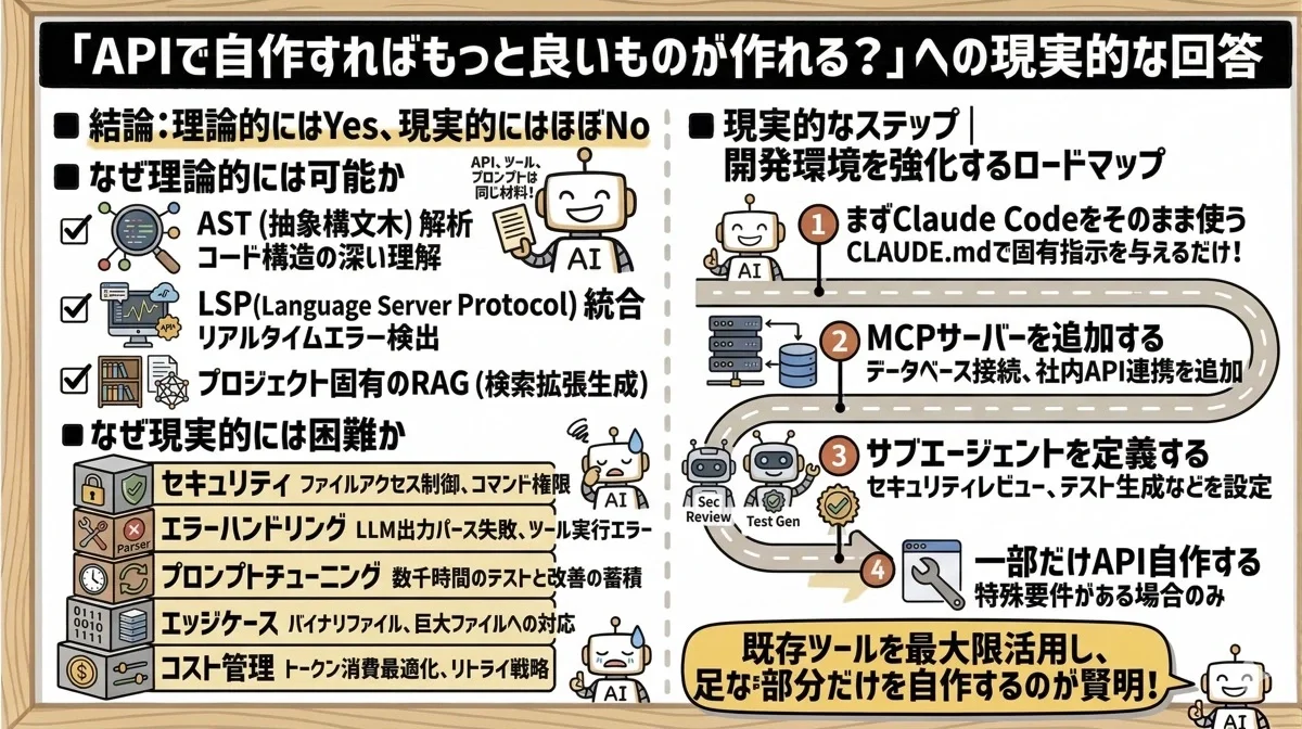 Claude Code自体が「API + ツール定義 + プロンプト設計」で構成されています。つまり、同じ材料で自作することは原理的に可能です。さらに、以下のような改善余地もあります。