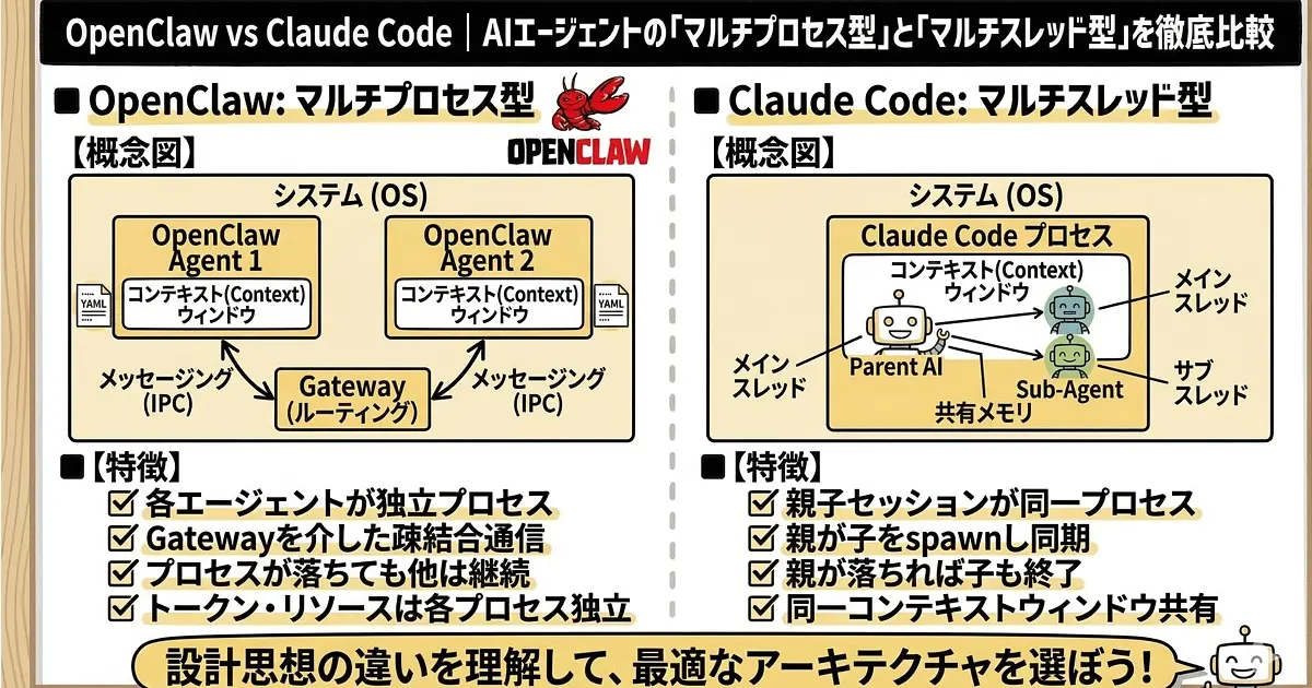 GitHub 24.7万スター。2026年最も注目されるオープンソースAIエージェント「OpenClaw」と、Anthropic公式のコーディングエージェント「Claude Code」。どちらもAIエージェントを複数連携させる仕組みを持っていますが、その設計思想は根本から異なります。