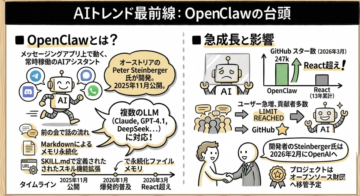Steinbergerは2026年2月にOpenAIへの参画を発表し、プロジェクトはオープンソース財団に移管される予定です。