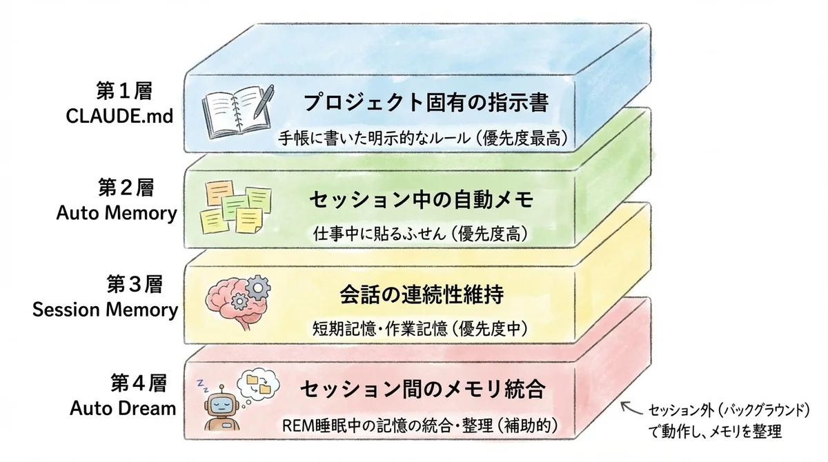 Auto Dreamの登場で、Claude Codeのメモリは明確な4層構造として整理できるようになりました。 これ、全体像がわかるとAuto Dreamのすごさがもっとよく見えてきます。