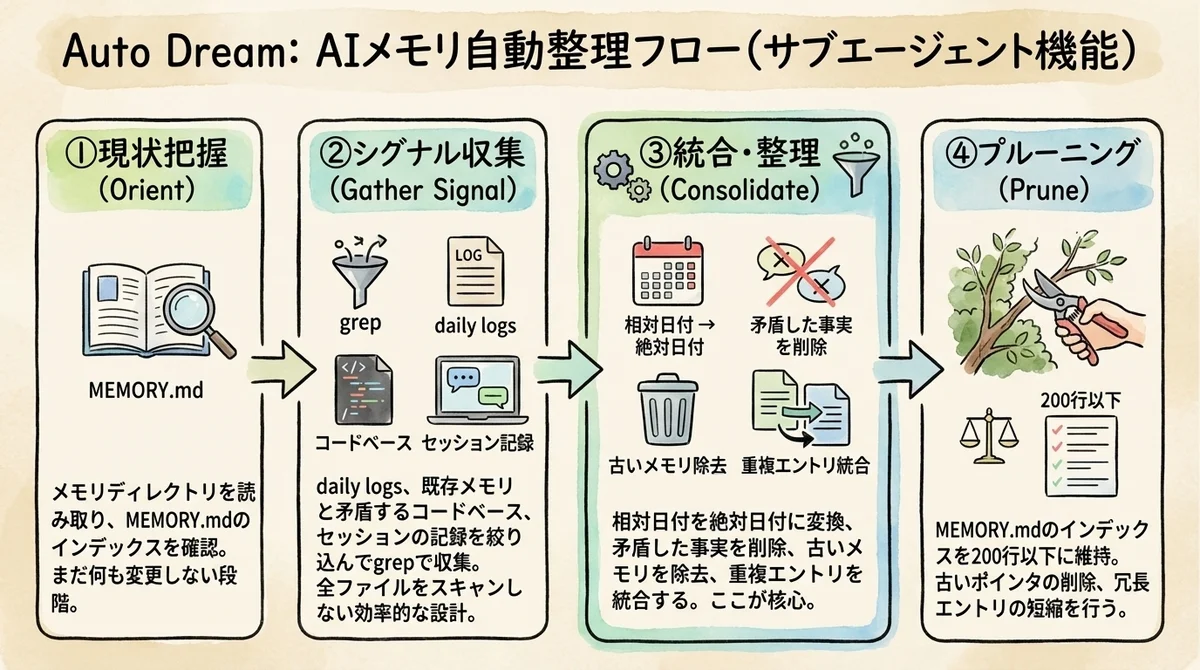 - Auto Dreamは4フェーズ(Orient → Gather Signal → Consolidate → Prune)でメモリを自動統合する