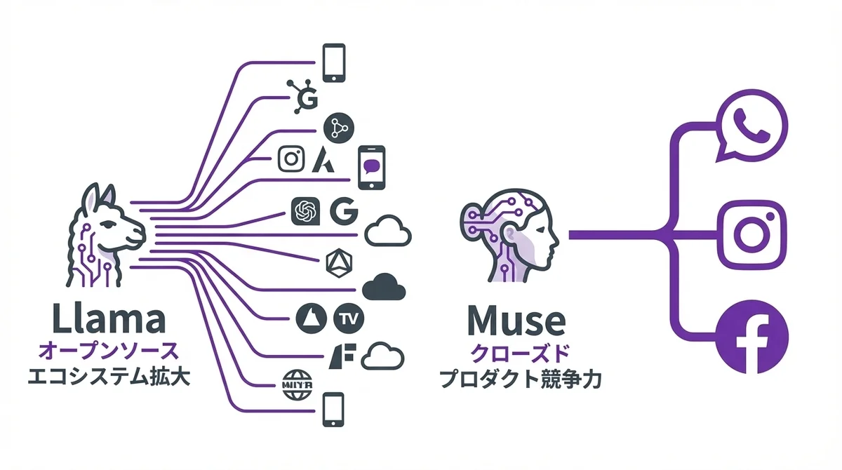 現実的には、Llamaシリーズ(オープン)とMuseシリーズ(クローズド)のデュアルトラック戦略になると見ています。