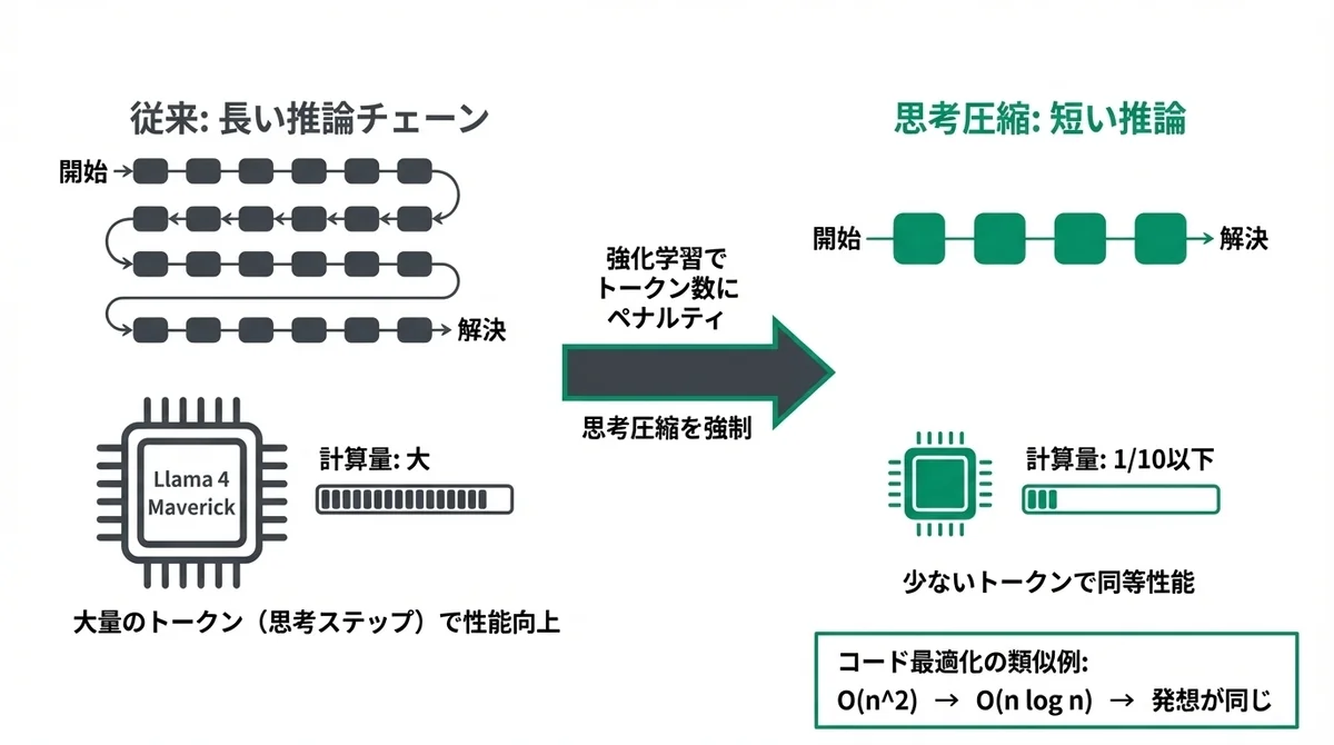「推論を長くすれば性能が上がる」という業界のトレンドに対して、「効率的に考える」方向で成果を出したのは技術的に大きな意味がある。