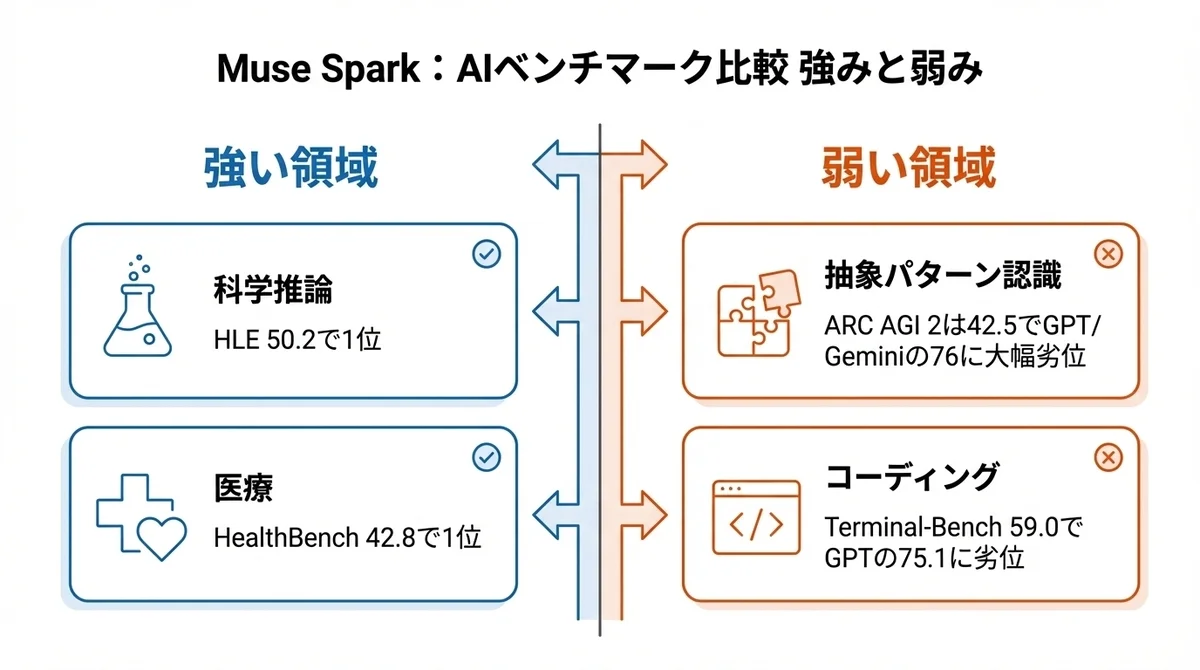 エンジニアとして率直に言えば、コード生成や開発支援の用途では、現時点でMuse Sparkを第一候補にする理由は薄い。