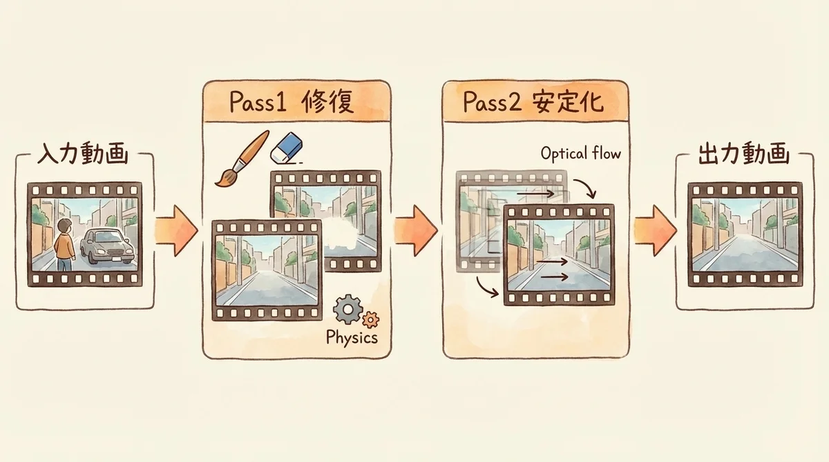 2パスアーキテクチャ - CogVideoXベースのベース修復と時間的一貫性の確保