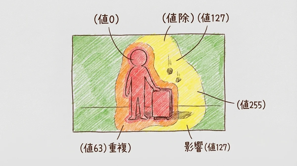 「4値マスク?」って思いますよね。従来の「消す/消さない」の2択に対して、VOIDは4つの状態を使い分けます。いわば「消す」「消す(境界部分)」「影響を受けて変化する」「そのまま」の4段階です。