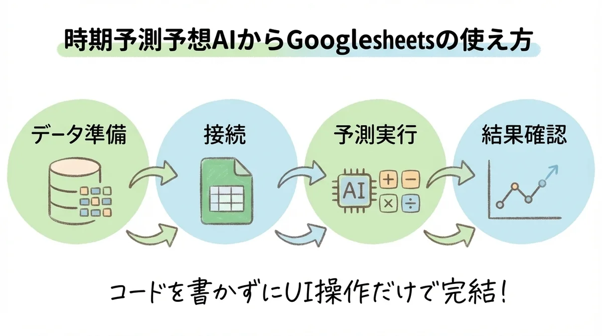 つまり、SQLもPythonも書かずに、スプレッドシートのUI操作だけで時系列予測ができるんです。