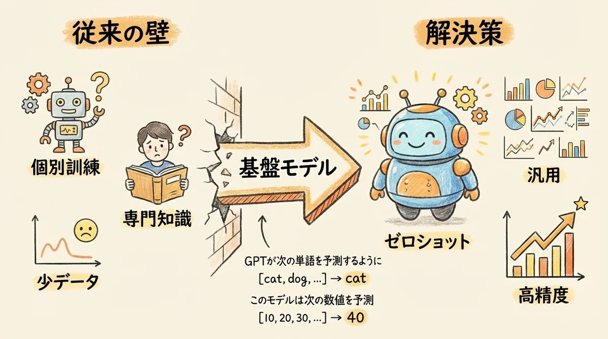 - トレーニング不要(ゼロショット予測): データを渡すだけで、事前学習済みの知識をもとに即座に予測を返してくれる。 個別のモデル構築が不要なんです。