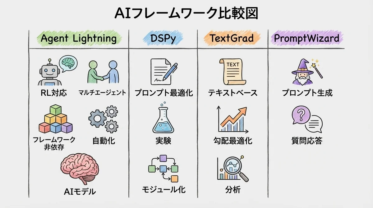 Agent Lightning vs 競合フレームワーク比較(DSPy・TextGrad・PromptWizard)