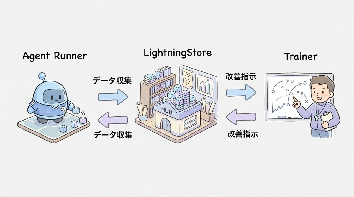 選手(Agent Runner)はひたすら試合をして、データ分析室(LightningStore)が全試合のデータを蓄積して、コーチ(Trainer)が分析結果をもとに改善指示を出す。