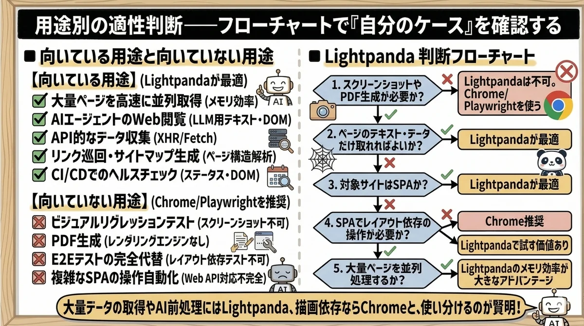 Lightpandaの特性を踏まえた、用途別の適性判断です。