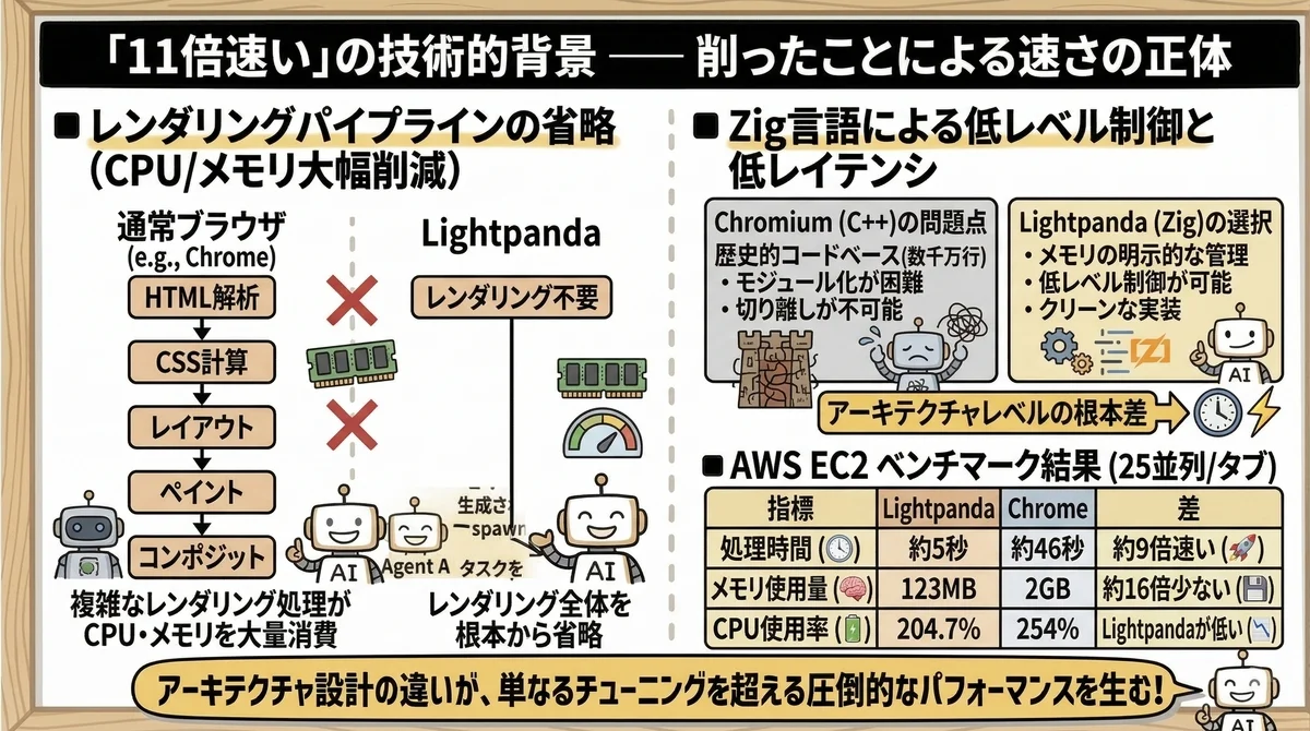 Lightpandaは「速いChrome」ではありません。レンダリングパイプラインを丸ごと捨てることで、ヘッドレス用途に特化した全く別のブラウザです。