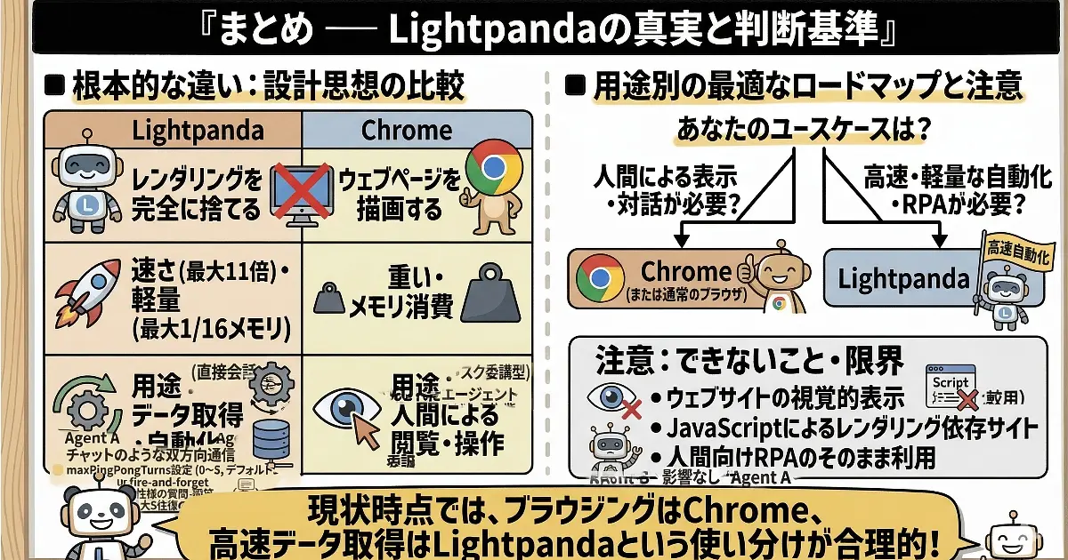 - SPAでレイアウト依存の操作が必要か? → Yes: Chrome推奨 / No: Lightpandaで試す価値あり