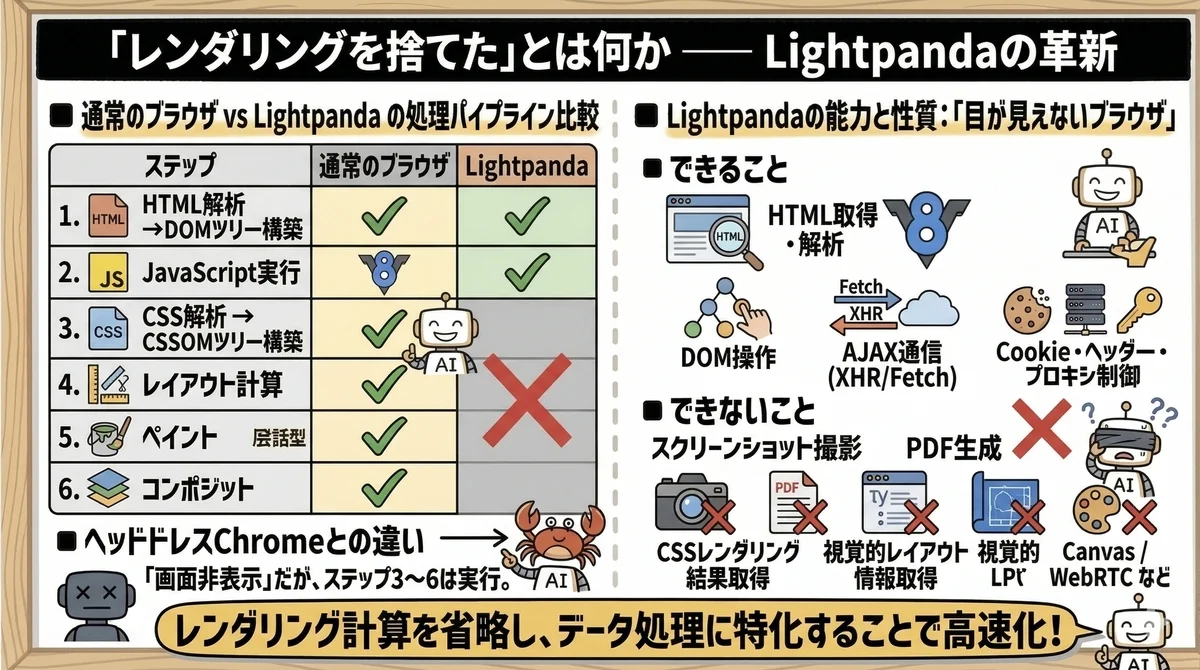 しかし、それは根本的に誤った理解です。Lightpandaは「速いChrome」ではなく、「レンダリングを丸ごと捨てたブラウザ」です。この違いを正しく理解しないと、導入後に「思っていたのと違う」という事態になりかねません。