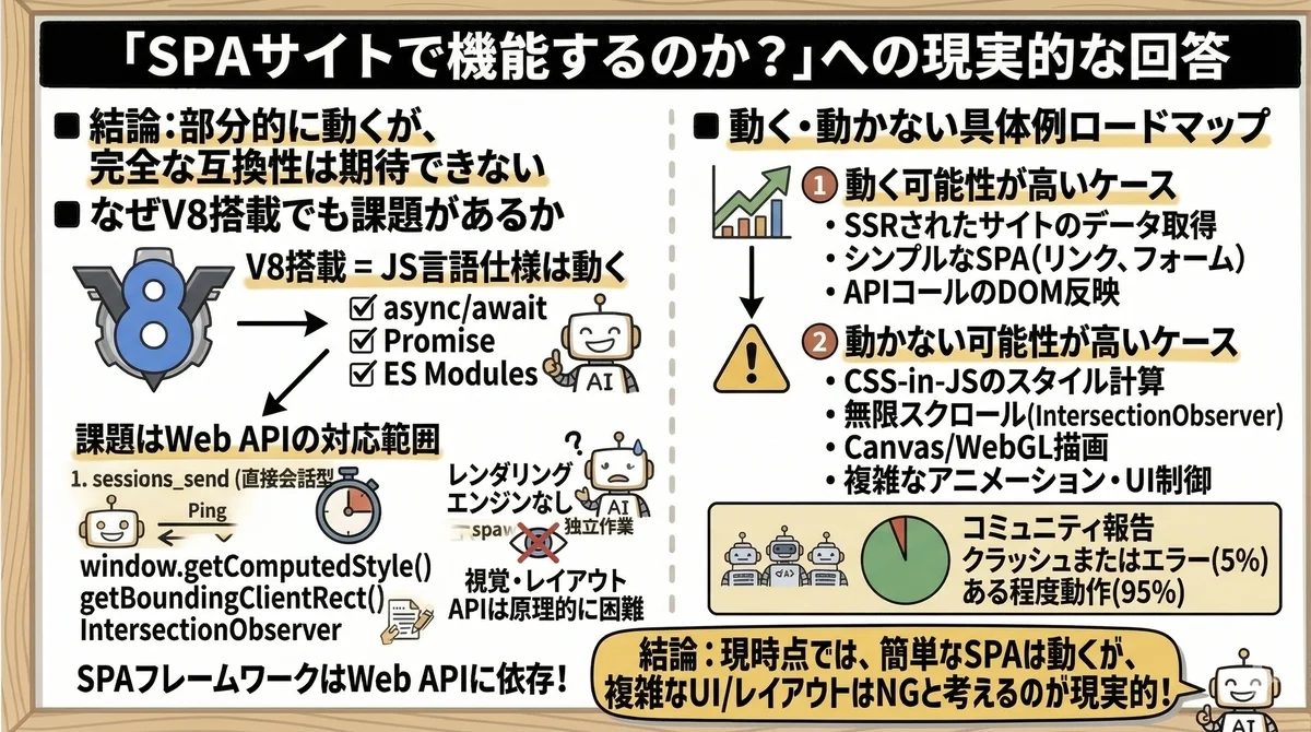 「Reactを使っているサイトならほとんど機能しないのでは?」という見方もありますが、これはやや悲観的すぎる評価です。正確には「Reactサイトでも、レイアウト情報に依存しない操作であれば動作する可能性がある。ただし、フルレンダリングを前提としたSPAの完全な再現は不可能」というのが実態です。