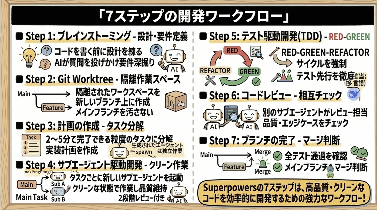Superpowersが提供する開発ワークフローは、以下の7つのステップで構成される。