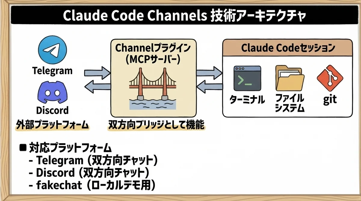 具体的には、claude/channel capabilityフラグを宣言したMCPサーバーがChannelプラグインとして動作します。このMCPサーバーが外部プラットフォーム(Telegram/Discord)とClaude Codeセッションの間の双方向ブリッジになる仕組みです。