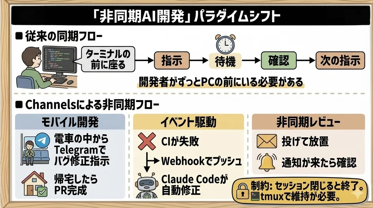 従来のClaude Codeの使い方は「ターミナルの前に座って、指示→待機→確認」の同期的なフロー。Channelsが可能にするのは:
