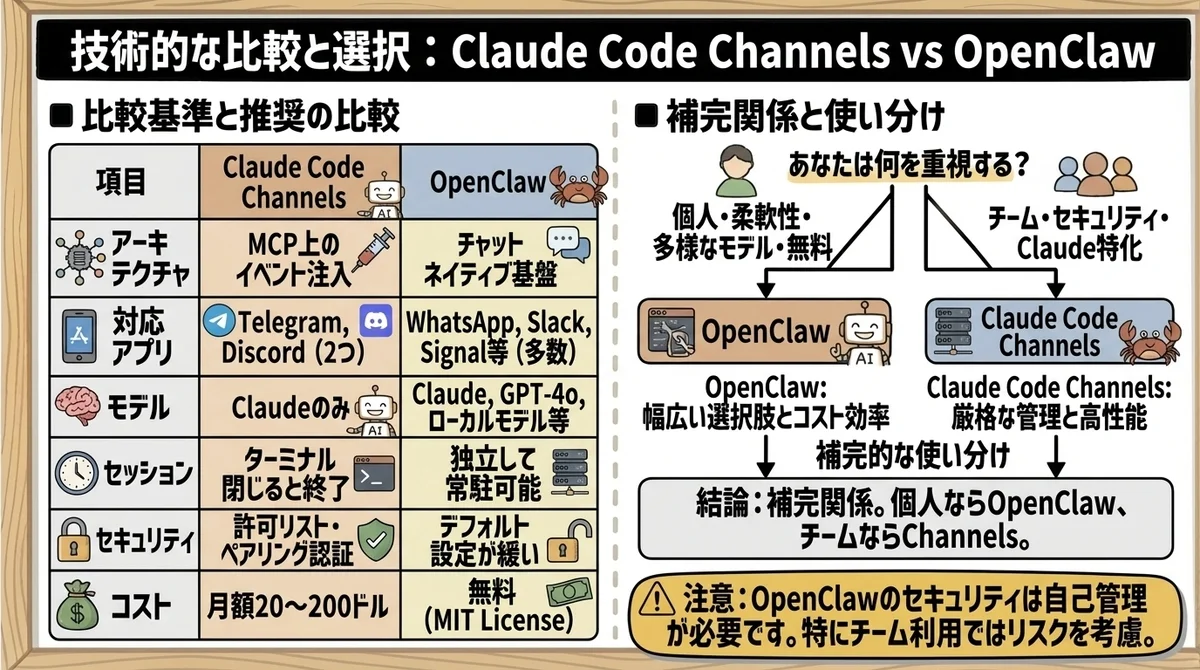 「個人プロジェクトで最大限の柔軟性」ならOpenClaw、「チーム環境でセキュリティが必要」ならChannelsというのが現時点の使い分けかと思います。