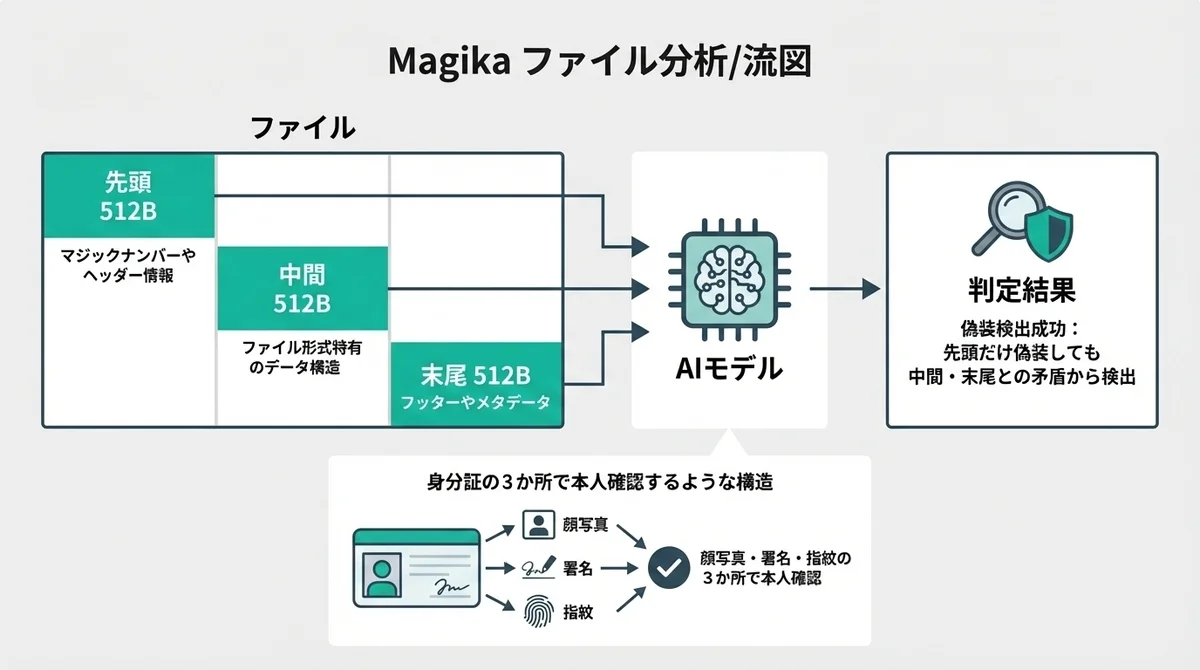 この3点を組み合わせることで何が嬉しいかっていうと、先頭のマジックナンバーだけを偽装しても、中間・末尾のデータパターンとの矛盾から偽装を検出できるんです。