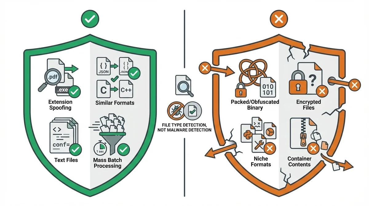 libmagicの「数千種類対応」は一見有利に見えますが、対応しているだけで精度が出ないケースが多いです。