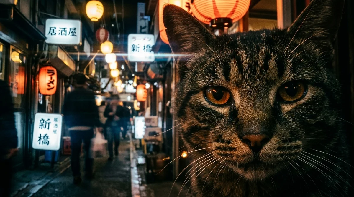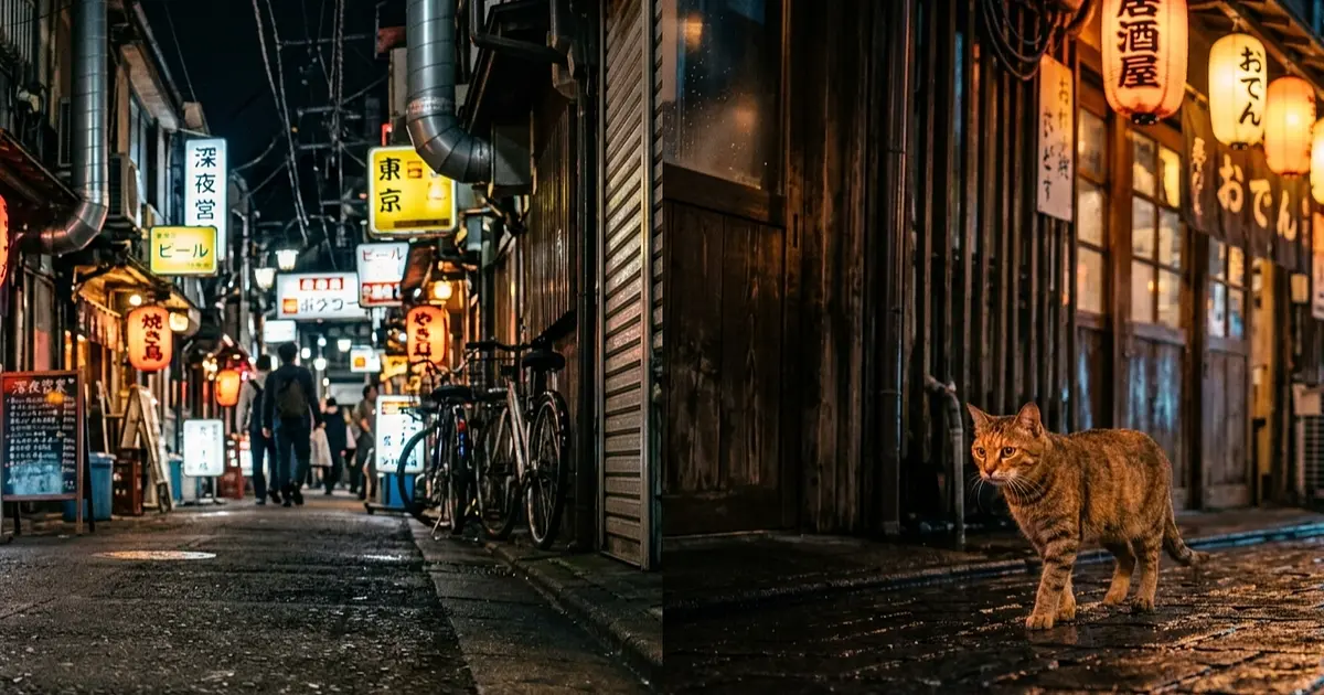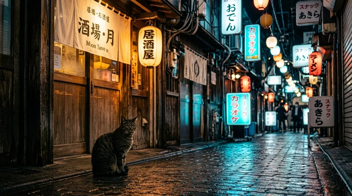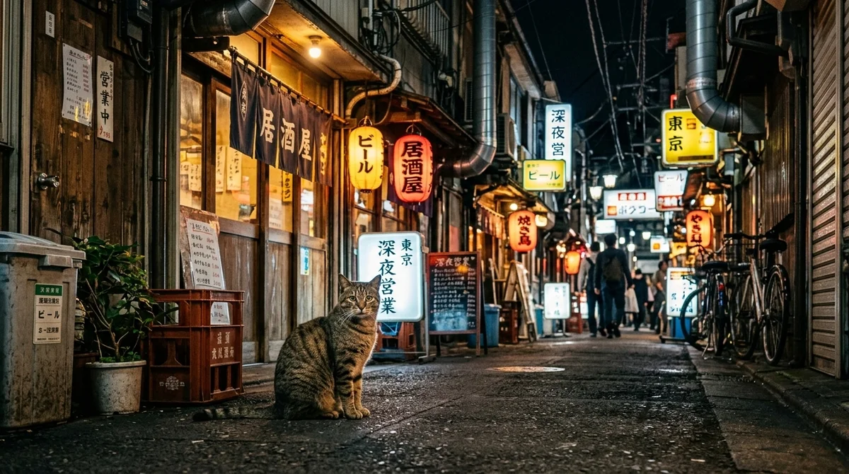 A cat sitting in a narrow Tokyo alley at night.