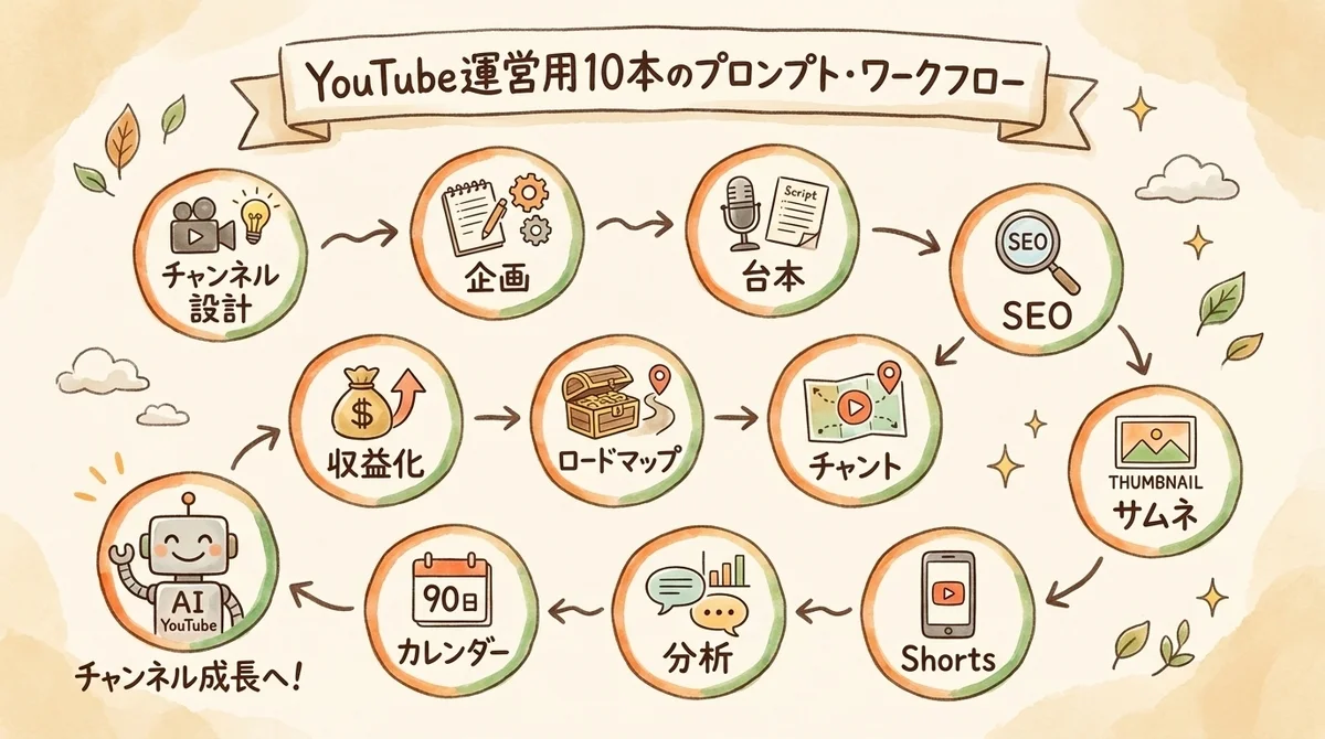 企画、台本、タイトル、サムネイルブリーフ、SEO、分析、収益化ロードマップまで、全部プロンプト10本でカバーする。
